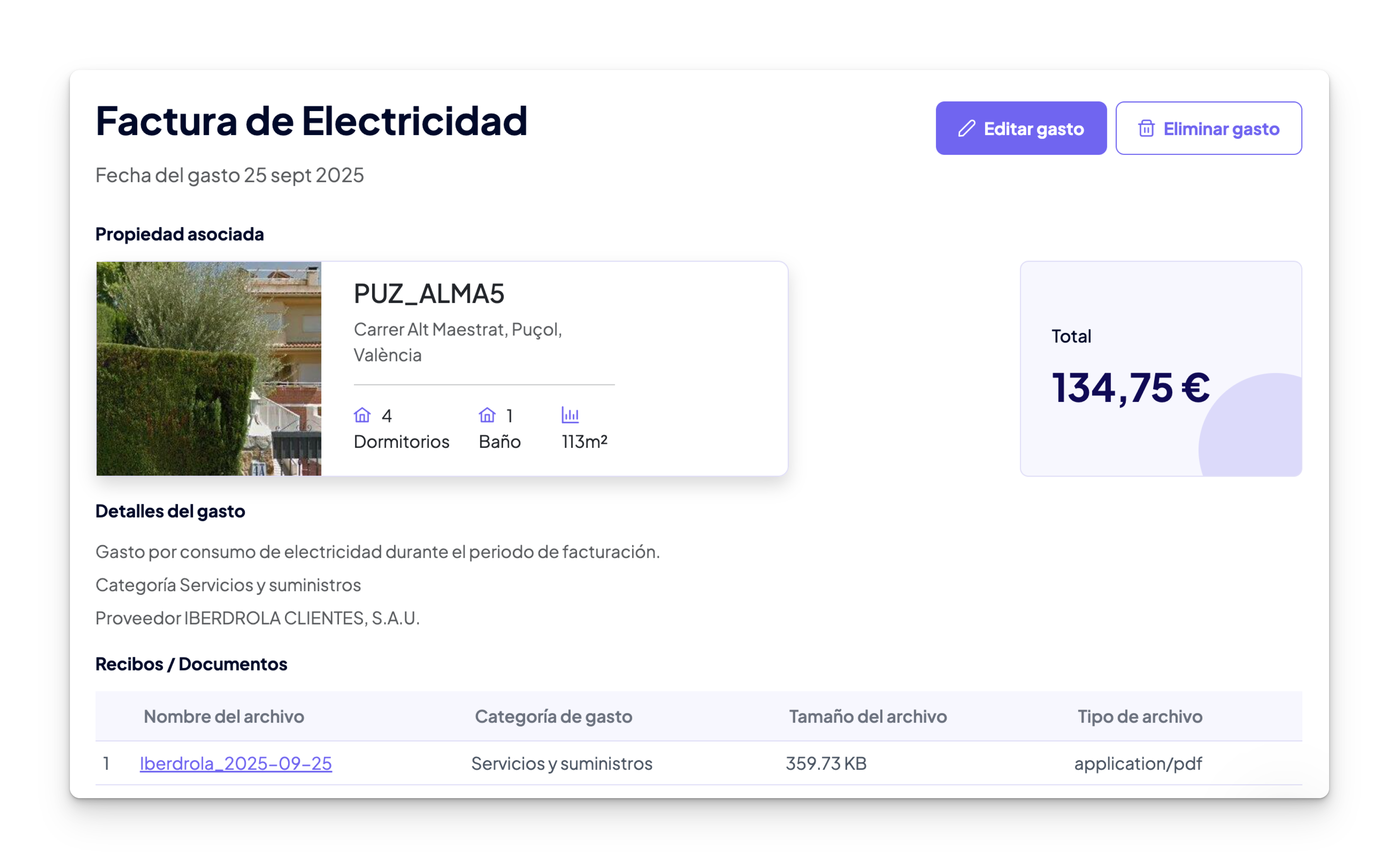 Los gastos se asignan automáticamente a la propiedad correspondiente basándose en el contexto.